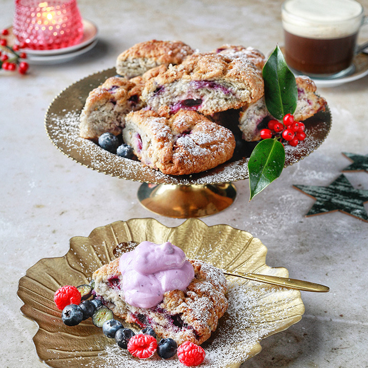 • Mix in the fresh blueberries and Glenisk organic greek style blueberry yogurt gently and form a ball of dough. Flatten the doughball on the baking sheet (approx. 2cm thick), sprinkle with some caster sugar and cut into 8 even segments.