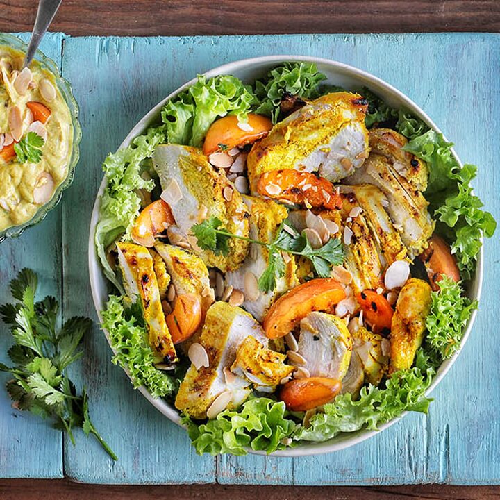 • Slice the chicken, place the salad leaves in the serving dish, arrange the cooked chicken over the top, sprinkle the rest of the apricots, almonds and serve with the sauce.