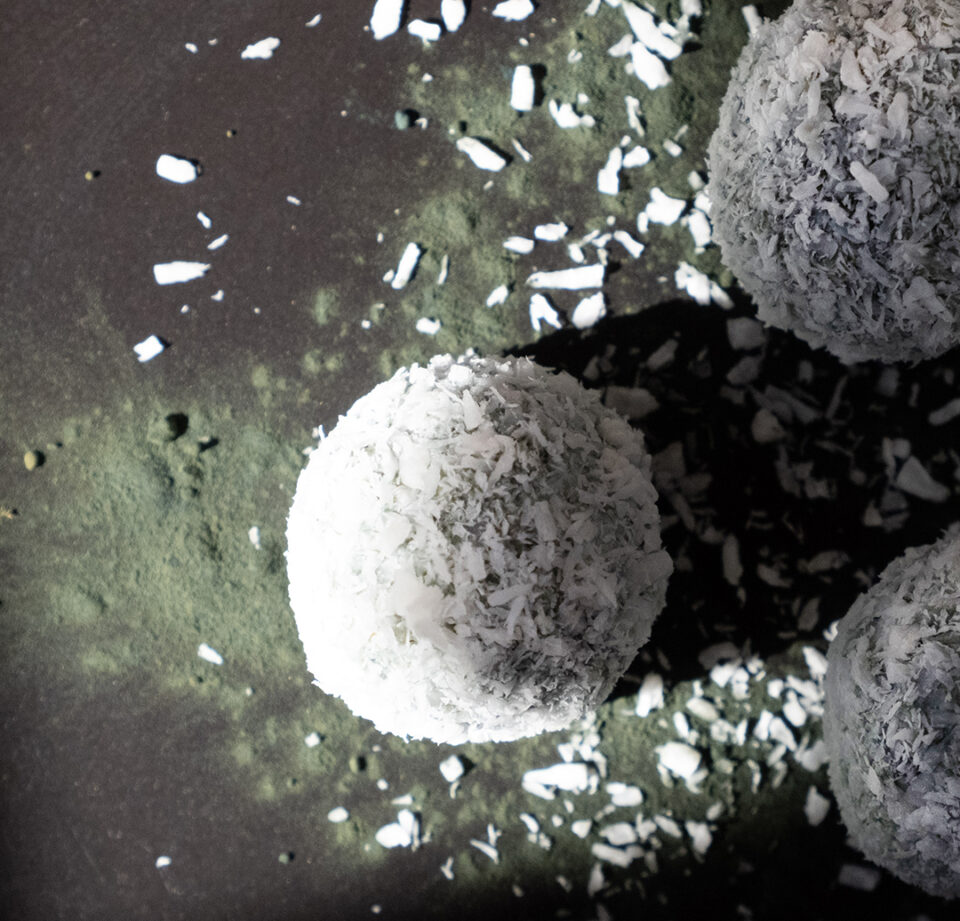 • Combine the yogurt, chia seeds, cacao nibs, blueberries, oats, matcha powder, range zest, most of the shredded coconut and a pinch of salt in a large bowl and whisk together. Save some shredded coconut for coating.