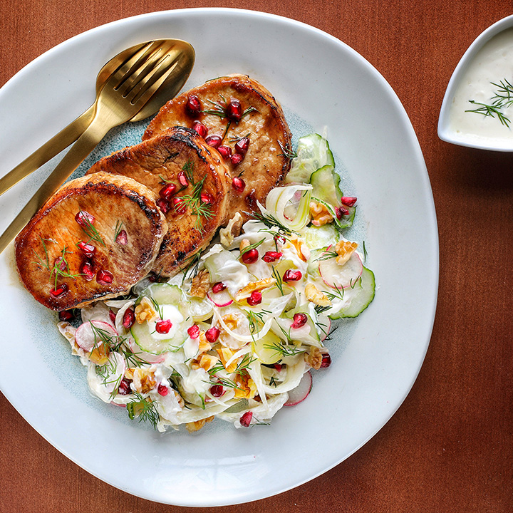 • Place the pork chops on a serving plate and add the dressed fennel. Toss with the other salad ingredient and garnish with fennel or dill fronds, pomegranate seeds and a drizzle of the remaining dressing