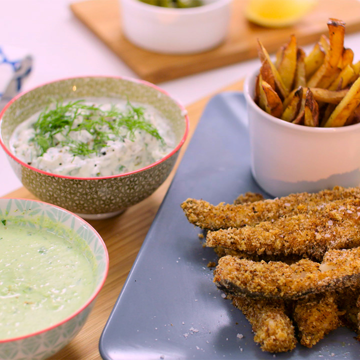 • Spray the goujons with rapeseed oil and roll in the breadcrumbs.
